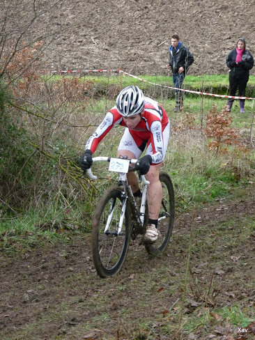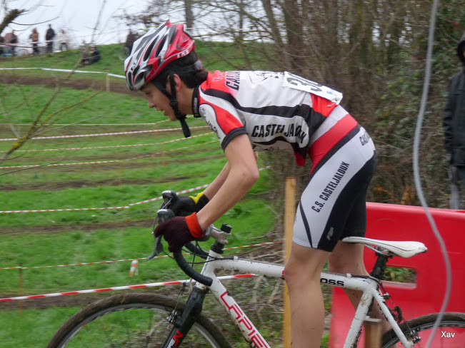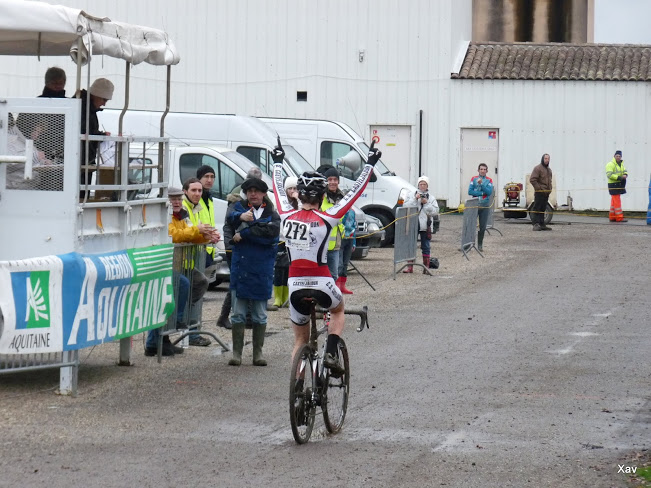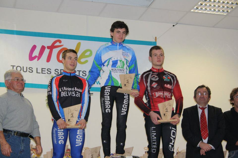 Mickaël Audureau monte lui aussi sur la plus haute marche du podium dans la catégorie Juniors. Le long retour de Nommay n'a pas pesé dans les jambes de notre coureur qui a pu profiter au début de la présence de Marvyn Valade. Petit à petit Marvyn a rétrogradé pour finalement se faire dépasser dans le dernier tour et prendre la médaille en chocolat de la 4° place. Félicitations donc à Mickaël qui se retrouve à ce jour double champion d'Aquitaine (FFC et Ufolep). Lui aussi devrait être proche du podium du championnat national, c'est tout le mal qu'on lui souhaite.
