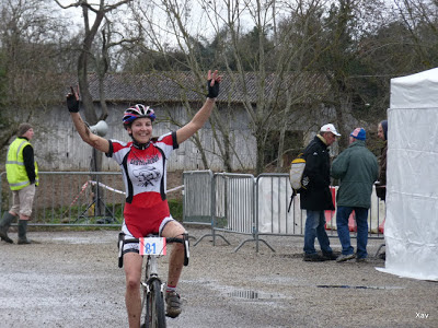 Mickaël Audureau monte lui aussi sur la plus haute marche du podium dans la catégorie Juniors. Le long retour de Nommay n'a pas pesé dans les jambes de notre coureur qui a pu profiter au début de la présence de Marvyn Valade. Petit à petit Marvyn a rétrogradé pour finalement se faire dépasser dans le dernier tour et prendre la médaille en chocolat de la 4° place. Félicitations donc à Mickaël qui se retrouve à ce jour double champion d'Aquitaine (FFC et Ufolep). Lui aussi devrait être proche du podium du championnat national, c'est tout le mal qu'on lui souhaite.