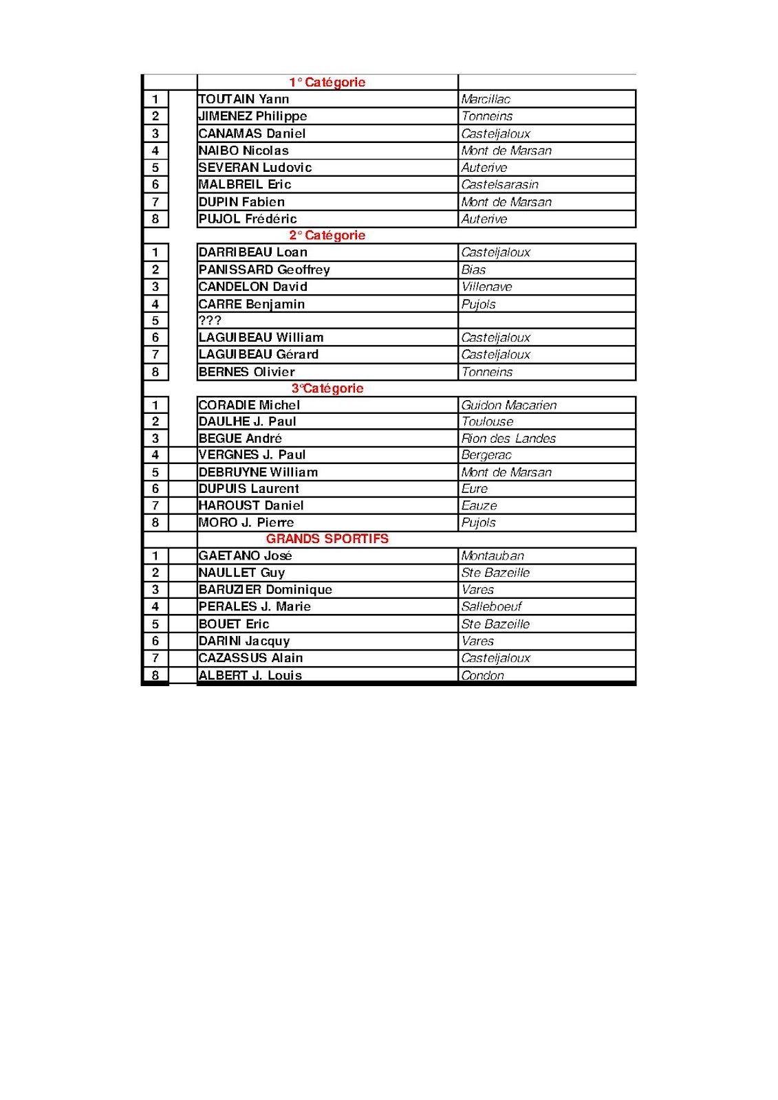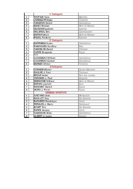 En GS, nous avons assisté à un sprint massif remporté par José Gaetano de Montauban devant le toujours jeune Guy Naullet de Sainte Bazeille. Alain Cazassus premier casteljalousain se classe 7°.