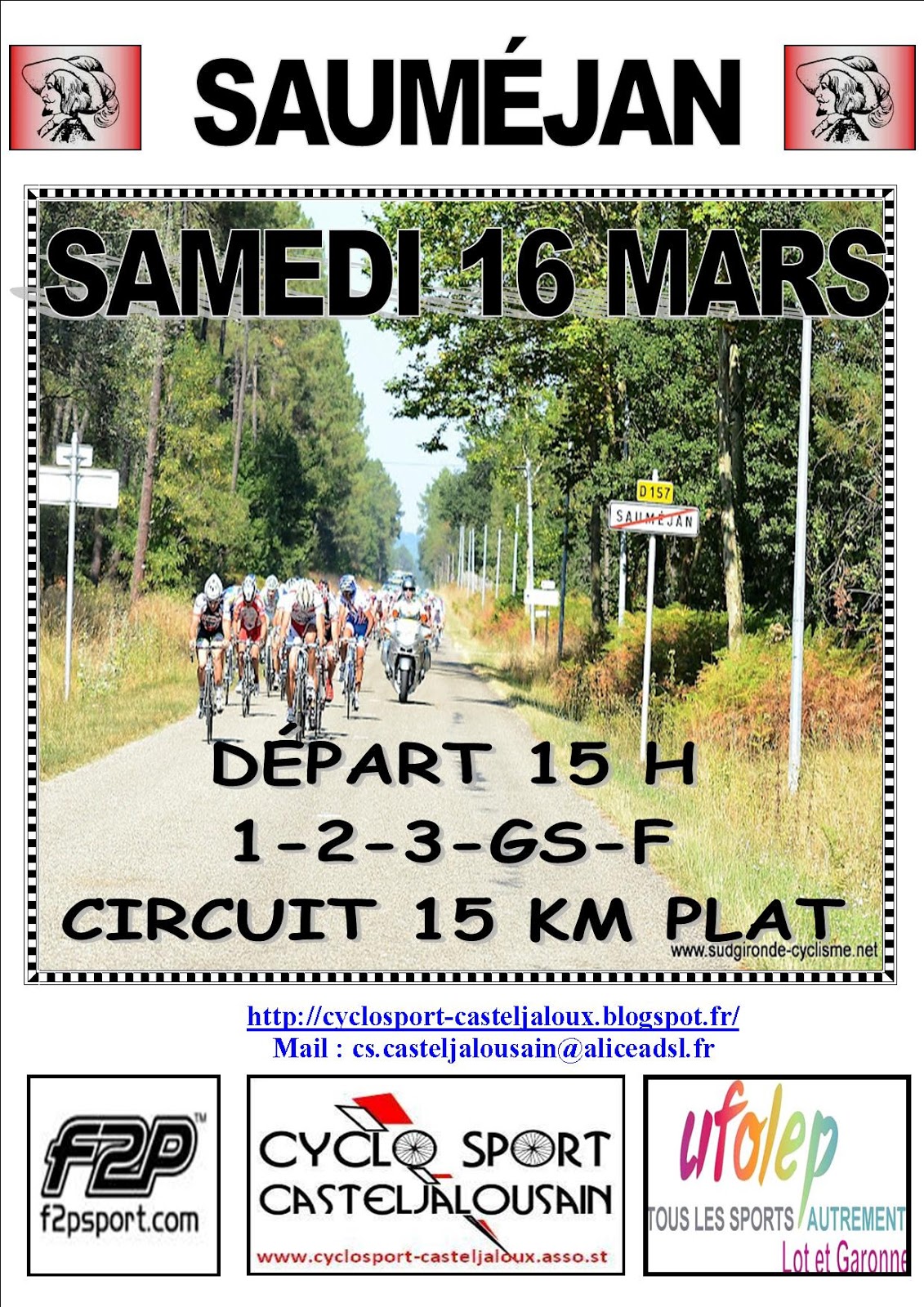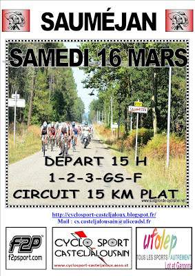 La première organisation route pour la saison 2013 se fera sur le circuit de Sauméjan le samedi 16 mars. Le traditionnel circuit de 15 km (identique à celui de Pindères) sera le terrain de jeu pour cette après-midi dans un cadre sylvestre bien agréable. Espérons que le beau temps soit de la partie et nous aurons de belles parties de manivelles à n'en pas douter.